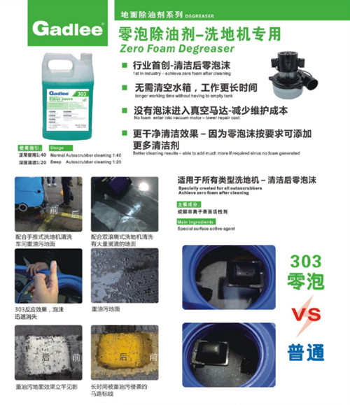 有些客户使用洗地机的时候,会用洗衣粉或者洗洁精来代替清洁剂使用,这是非常不合适的。虽然他们都能够在一定程度上来清洗油污的地面,但是在实际的使用中是有一些问题的。 首先洗衣粉和洗洁精泡沫很丰富,洗地机采用的是吸水电机抽真空的方式来吸收地面的污水,但是泡沫容易被吸到吸水电机中会导致电机的损坏,而且浮球不能阻挡泡沫,隔泡网也只能阻隔少量的泡沫。 其次,洗衣粉作为一种固体的清洁剂,很难完全溶于水中,会在清水箱中堆积,这些沉淀物会透过过滤网进入到放水管道中,导致电磁阀堵塞或者漏水。 因此客户在使用洗地机的时候,最好不要使用洗衣粉或者洗洁精,要采用专业的低泡清洁剂,最好在污水箱中放入适量的消泡剂,可以减少对机器的伤害。 嘉得力零泡除油剂不仅可以强力去除地面污渍,还可以更好的保护洗地机吸水电机,更大程度上减少了维护成本,因此选择对的清洁剂,是对洗地机最好的保养!